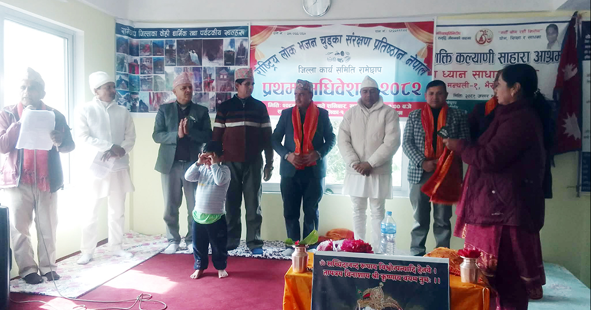 रामेछाप । रामेछाप जिल्ला मन्थली नगरपालिका वडा नं. १ मा २०८२ माघ १० गते शनिबार भैँसेश्वर वृद्धाश्रम भवनमा राष्ट्रिय लोक भजन चुड्का संरक्षण प्रतिष्ठान नेपालको