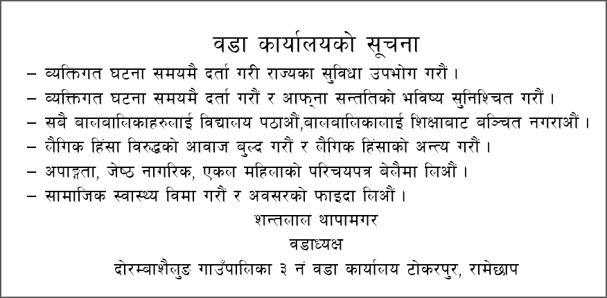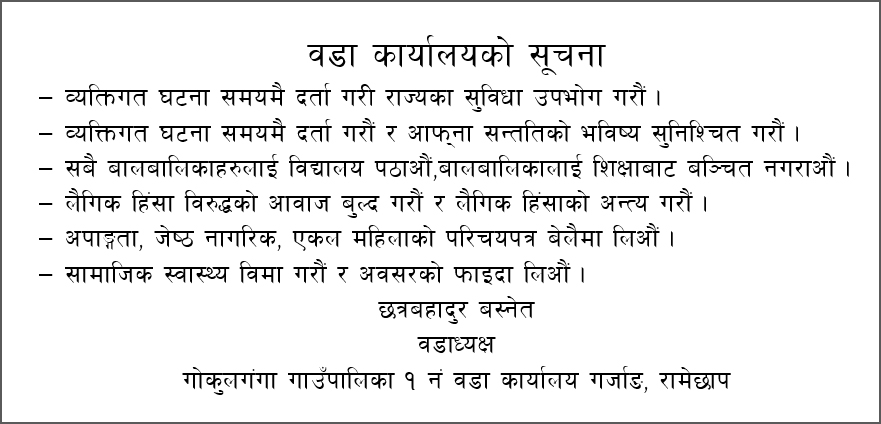 इज्याचारदमाहिँसादास्वाध्यायकर्मणाम् । अयं तु परमोधर्मो यद्योगेनात्मदर्शनम् ।। धर्म,अर्थ,काम मोक्ष “यतोभ्युदय निश्रेयस सिद्विःसधर्मः।”पण्डितः– शिव प्रसाद घिमिरे संवाद पिण्डिकासेचन,वसन्तिपूजा,ग्रहसमिध,देवतर्पणम् सूयदर्शन, नामकरण, षष्ठिकाध्यान र जातकर्मण विषयः ऋग्वेद आचार्य टंकनाथ गौतम छलफल पूजा वादविवाद भयम्ः ।